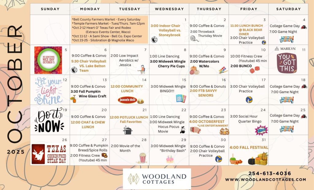 Community is at the heart of Woodland Cottages, making us stand out as one of the most welcoming 55+ communities in Belton, TX. Our events calendar makes it easy for all residents to stay active and social. From casual get-togethers to seasonal celebrations, there’s always something happening that brings neighbors together. Every event is optional but always open, giving you the freedom to enjoy community life on your own terms. Events are subject to change, so if you have any questions, feel free to call or stop by the community center. We are here for you!